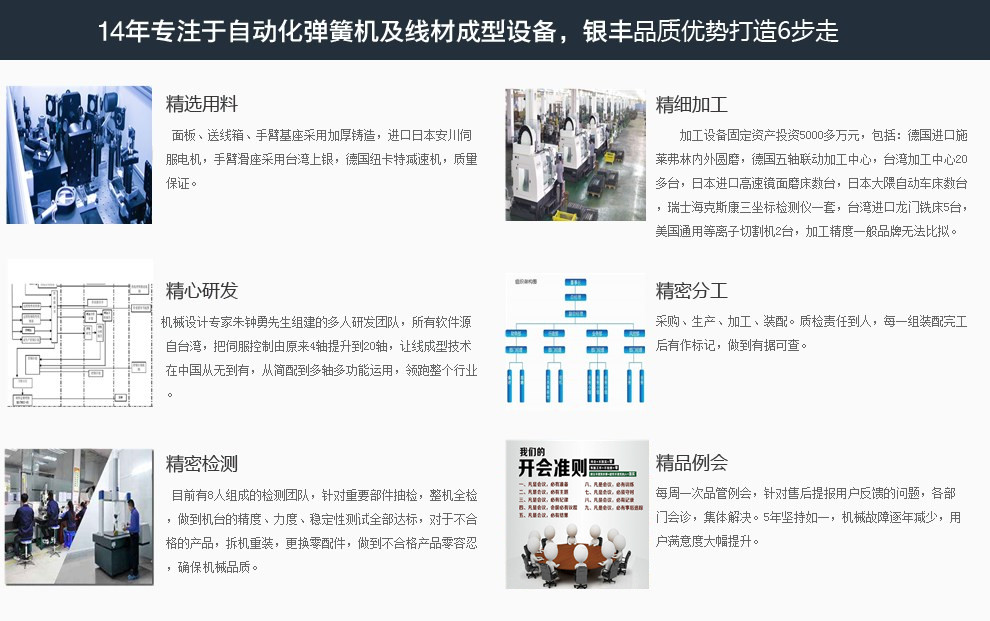 銀豐自動化科技(杭州)有限公司2014年成立于浙江杭州。是中國浙江專業(yè)生產(chǎn)彈簧機及線材折彎機的技術(shù)型企業(yè)。2014年公司運用日本新先進的伺服系列控制技術(shù),進行一次次具有重要意義的技術(shù)改革,打破傳統(tǒng)的凸輪帶動成型模式,成為浙江省內(nèi)能夠獨立生產(chǎn)無凸輪模式兼?zhèn)錂C械手的彈簧機及轉(zhuǎn)線線材折彎機,目前公司每年銷售各類機型7百余臺,成為行業(yè)銷量領(lǐng)先的企業(yè),也因為高性價比被廣大客戶群體追捧,同時也受到部分友商的詆毀。